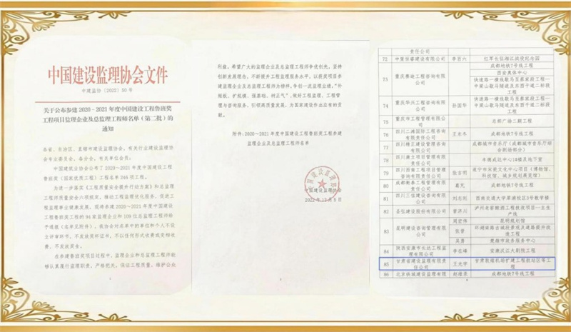 項(xiàng)目榮獲中國建設(shè)工程魯班獎,項(xiàng)目總監(jiān)理工程師榮獲“先進(jìn)個人”榮譽(yù)稱號