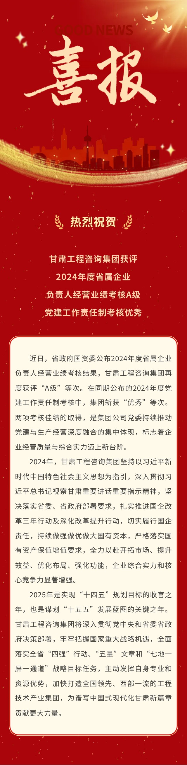 喜報(bào) | 甘肅工程咨詢集團(tuán)榮獲2024年度省屬企業(yè)考核“雙優(yōu)”佳績:經(jīng)營業(yè)績考核A級(jí)、黨建工作責(zé)任制考核優(yōu)秀