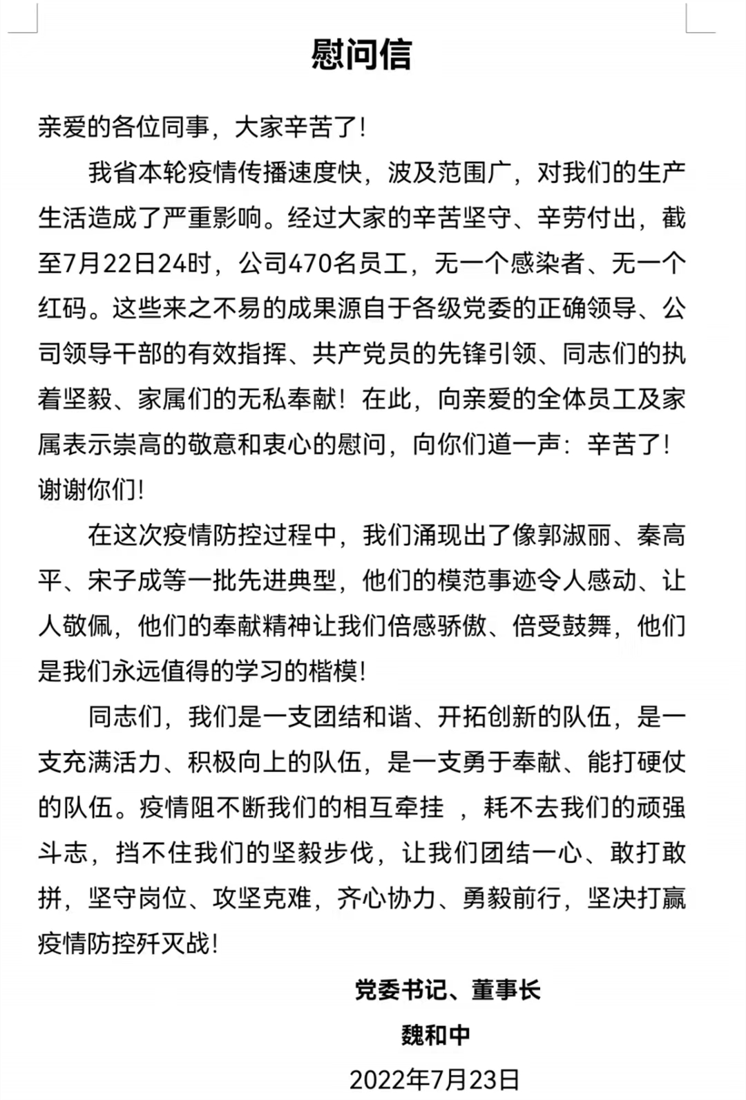 近日,甘肅省建設(shè)監(jiān)理有限責(zé)任公司黨委書記、董事長(zhǎng)魏和中向全體職工發(fā)出慰問信,對(duì)在疫情期間值守項(xiàng)目一線和抗戰(zhàn)疫情一線的黨員干部職工致以最誠摯的關(guān)心和感謝。同時(shí),號(hào)召全體干部職工向疫情防控期間涌現(xiàn)出的一線先進(jìn)典型個(gè)人和共產(chǎn)黨員先鋒者學(xué)習(xí),團(tuán)結(jié)一心、敢打敢拼,堅(jiān)守崗位、攻堅(jiān)克難,齊心協(xié)力、勇毅前行,堅(jiān)決打贏疫情防控殲滅戰(zhàn)。