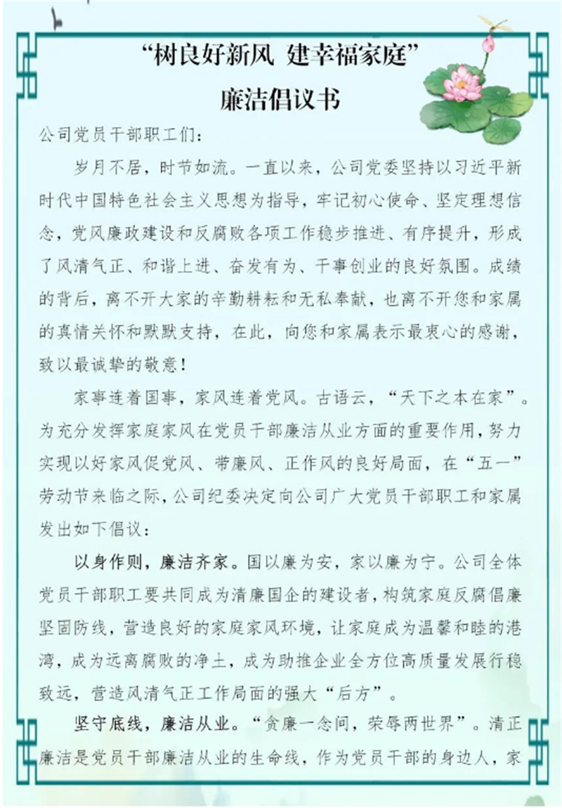集團公司把家風建設(shè)作為廉潔文化建設(shè)的重要一環(huán),結(jié)合文明家庭創(chuàng)建,開展家庭助廉教育,以家風促作風,以親情促廉情。