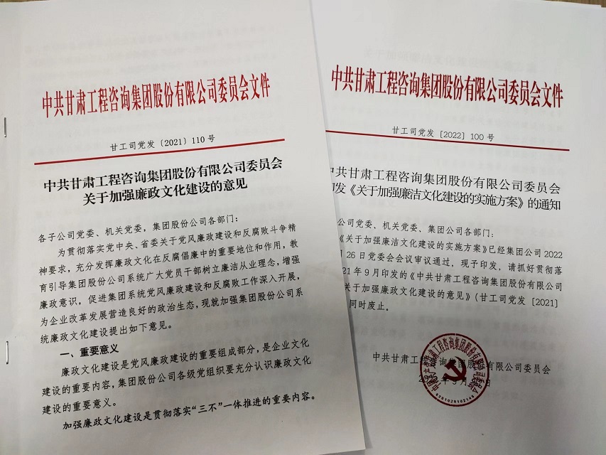 作為新組建的產(chǎn)業(yè)集團,甘肅工程咨詢集團把資產(chǎn)整合、產(chǎn)業(yè)耦合和文化融合作為集團公司組建的重要內(nèi)容,其中讓廉潔文化建設(shè)在企業(yè)文化建設(shè)中先行一步,早安排早部署,2021年9月集團公司黨委研究印發(fā)《關(guān)于加強廉政文化建設(shè)的意見》,在中共中央辦公廳《關(guān)于加強新時代廉潔文化建設(shè)的意見》和省委《實施方案》印發(fā)后,又及時對標(biāo)、查缺補漏,2022年9月修訂印發(fā)《關(guān)于加強廉潔文化建設(shè)的實施方案》,為新時代集團公司加強廉潔文化建設(shè)提供了指導(dǎo)。自組建以來,集團公司廉潔文化建設(shè)力求在“內(nèi)化于心”上下功夫,在“外化于行”上求實效,引導(dǎo)干部職工廉潔從業(yè),廉潔用權(quán),積極營造“崇廉、尚廉、倡廉、守廉”的企業(yè)風(fēng)尚和發(fā)展氛圍。
