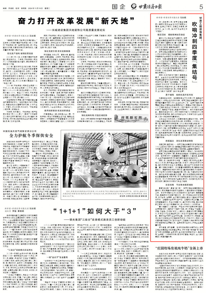 甘肅工程咨詢集團堅定向改革要動力要活力,加快向市場化程度高、綜合競爭力強、具有自主造血能力的國有企業(yè)轉(zhuǎn)型邁進。在開展對標(biāo)一流管理提升、質(zhì)量提升、價值創(chuàng)造、品牌建設(shè)、企業(yè)家培育等專項行動等方面取得實實在在的成效。
