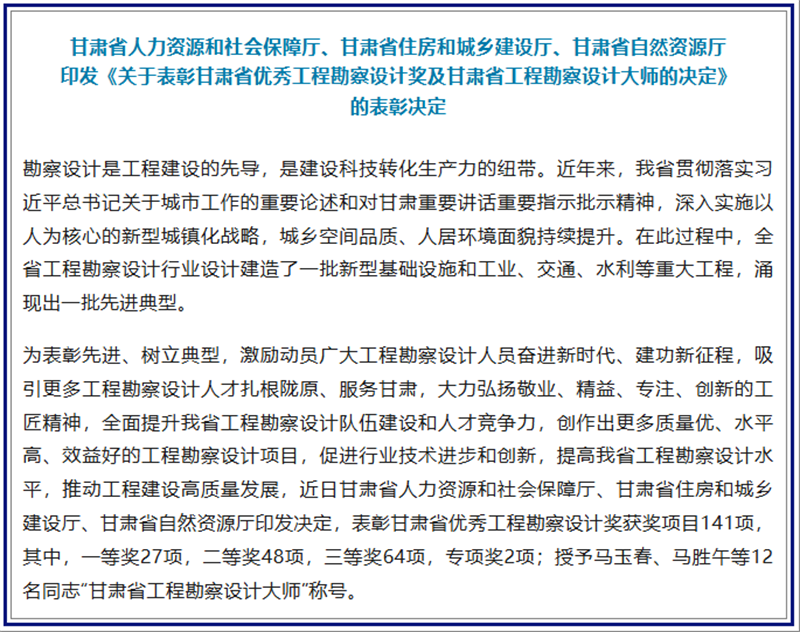 7.甘肅工程咨詢集團(tuán)斬獲多項(xiàng)勘察設(shè)計(jì)獎(jiǎng)項(xiàng)