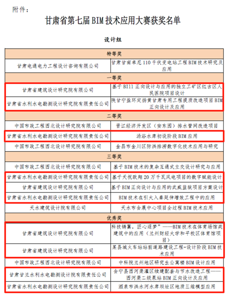 在甘肅省第七屆BIM技術(shù)應(yīng)用大賽中,建筑設(shè)計(jì)院、水電設(shè)計(jì)院報(bào)送的項(xiàng)目共斬獲12項(xiàng)獎(jiǎng)勵(lì),包攬了設(shè)計(jì)組16個(gè)獎(jiǎng)項(xiàng)中的10項(xiàng)。在甘肅省第五屆“創(chuàng)新杯”工業(yè)設(shè)計(jì)大賽中,水電設(shè)計(jì)院《引調(diào)水工程數(shù)字化BIM建模平臺(tái)》項(xiàng)目獲優(yōu)秀獎(jiǎng)。在第十七屆全省職工優(yōu)秀技術(shù)創(chuàng)新成果獎(jiǎng)中,水電設(shè)計(jì)院、土木工程院申報(bào)的兩個(gè)項(xiàng)目分獲創(chuàng)新成果獎(jiǎng)三等獎(jiǎng),其中,《棄渣場(chǎng)三維設(shè)計(jì)平臺(tái)》項(xiàng)目是全省水利系統(tǒng)唯一獲獎(jiǎng)成果。