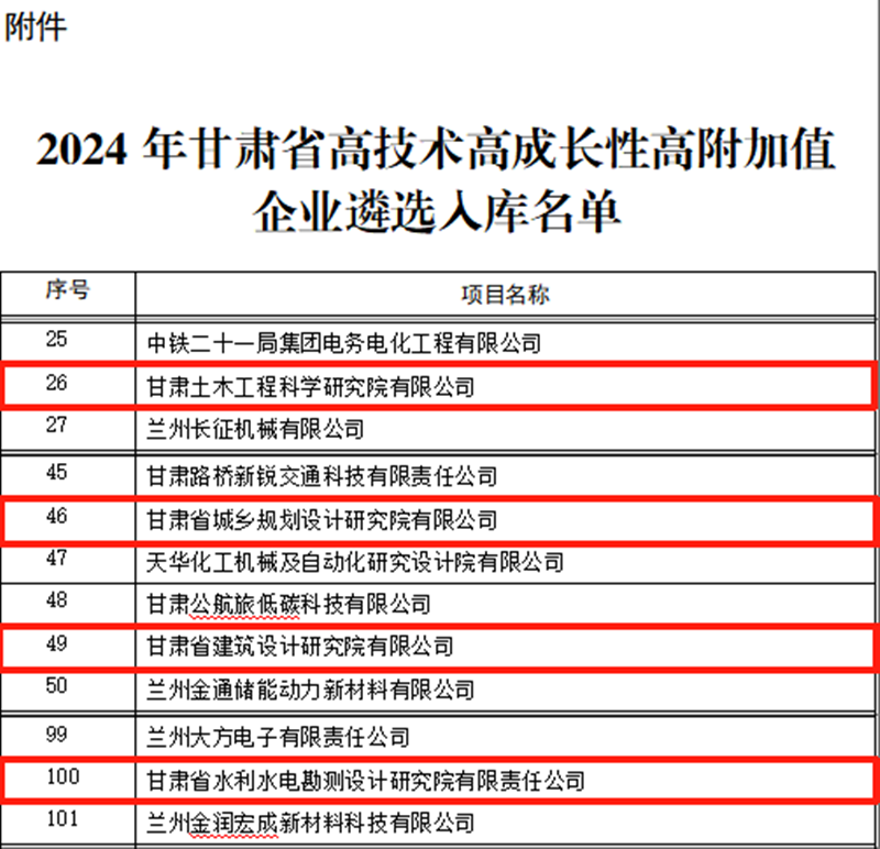 近日,甘肅省科技廳公布2024年甘肅省高技術(shù)高成長(zhǎng)性高附加值(簡(jiǎn)稱(chēng)“三高”)企業(yè)名單,甘肅工程咨詢(xún)集團(tuán)旗下省建筑設(shè)計(jì)院、省水電設(shè)計(jì)院、省城鄉(xiāng)規(guī)劃院、甘肅土木工程院從眾多企業(yè)中脫穎而出,成功登上全省首批“三高”企業(yè)榜單。