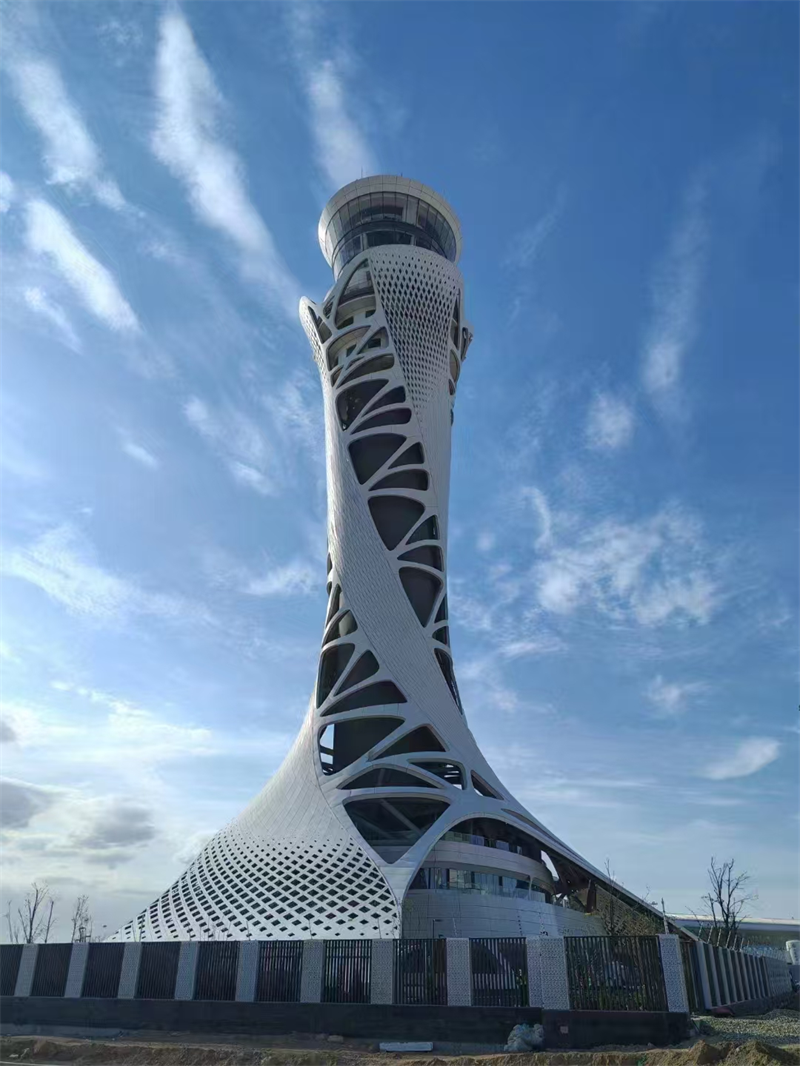 項目總投資13.43億元,塔臺建筑高度99.9米,是全國空管分局有史以來建設規(guī)模最大、投資最大的空管建設項目,創(chuàng)造了多項分局站建設第一。項目總體以“敦煌飛天”與“絲綢之路”為靈感,塔臺采用鋼結構斜交網(wǎng)格外框+鋼筋混凝土核心筒設計,空管工作區(qū)采用鋼筋混凝土框架+首層BRB支撐+基礎橡膠隔震支座設計,鋼結構總量達3561噸。