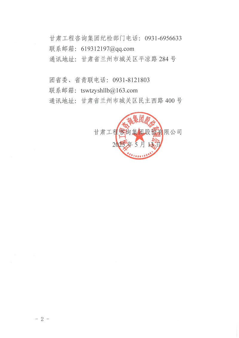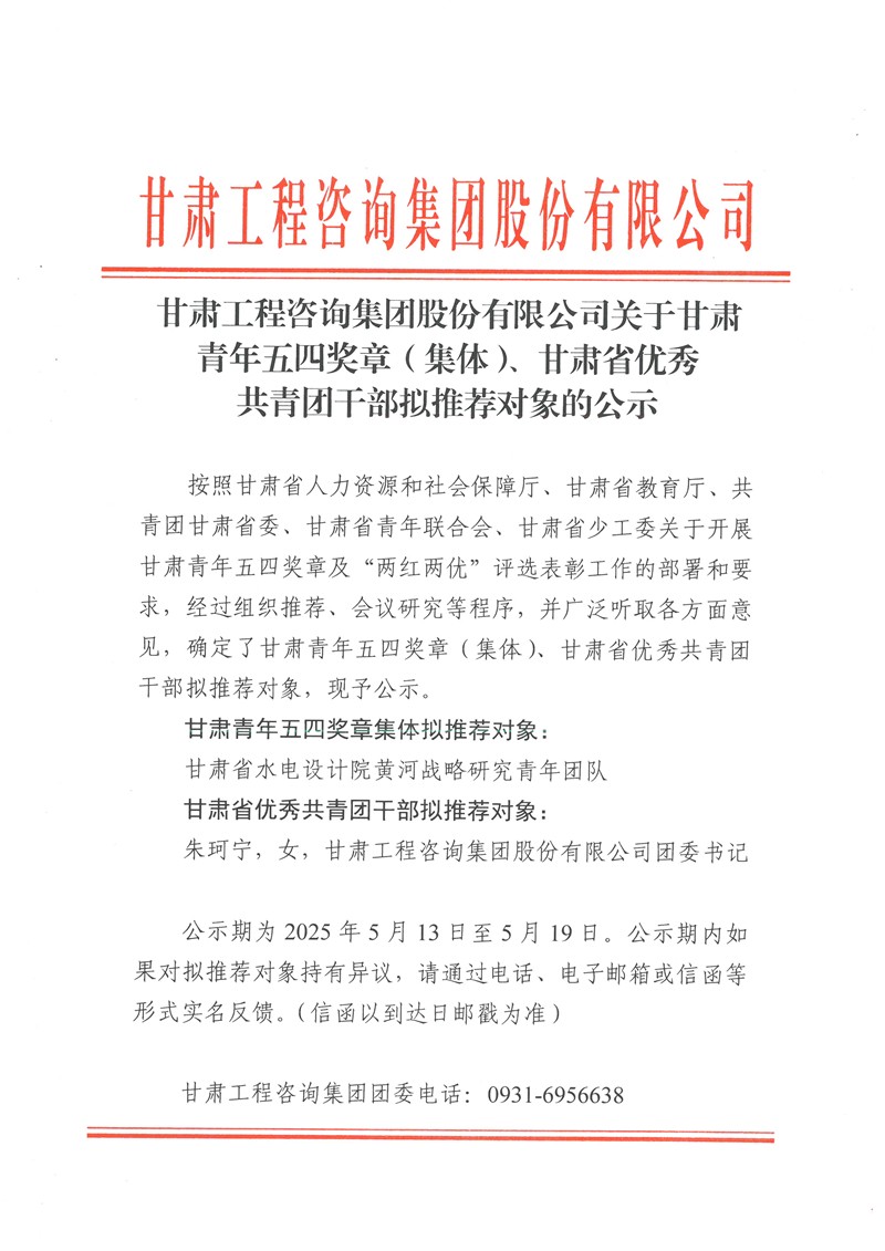 甘肅工程咨詢集團股份有限公司關(guān)于甘肅青年五四獎章(集體)、甘肅省優(yōu)秀共青團干部擬推薦對象的公示