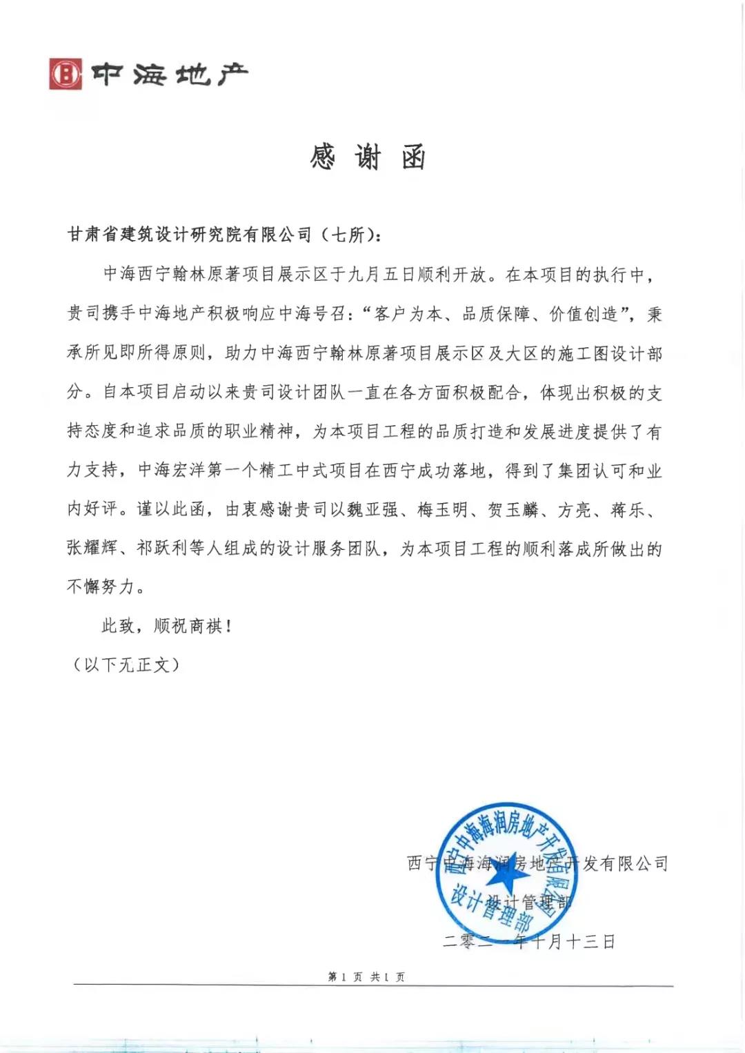 感謝信是認(rèn)可,是鼓勵,也是鞭策,建筑設(shè)計(jì)院全體職工紛紛表示,要向設(shè)計(jì)七所西寧中海翰林原著項(xiàng)目設(shè)計(jì)團(tuán)隊(duì)學(xué)習(xí),立足市場、抓好服務(wù),至臻至善、追求卓越,建功新時(shí)代,奮進(jìn)新征程。