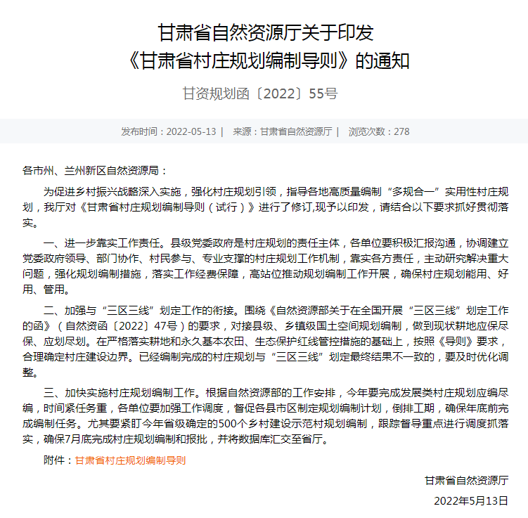 為深入貫徹習(xí)近平總書記視察甘肅重要講話和指示精神,落實(shí)省委、省政府關(guān)于村莊規(guī)劃工作部署,促推鄉(xiāng)村振興戰(zhàn)略深入實(shí)施,指導(dǎo)各地高質(zhì)量編制“多規(guī)合一”實(shí)用性村莊規(guī)劃。近日,由甘肅省自然資源廳牽頭組織,甘肅省城鄉(xiāng)規(guī)劃設(shè)計(jì)研究院有限公司參與起草的《甘肅省村莊規(guī)劃編制導(dǎo)則》正式印發(fā)實(shí)施。