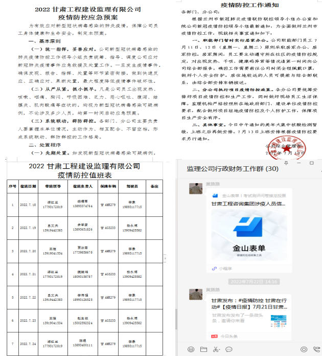 統(tǒng)籌部署,扎牢戰(zhàn)疫“防控網(wǎng)”。7月10日,面對(duì)本輪嚴(yán)峻復(fù)雜的疫情防控形勢(shì),建筑設(shè)計(jì)院監(jiān)理公司黨支部高度重視,迅即行動(dòng),搶抓“時(shí)間窗口”,建立完善疫情防控預(yù)案,印發(fā)《疫情防控工作通知》,落實(shí)機(jī)關(guān)職能部門居家辦公要求,統(tǒng)籌安排項(xiàng)目駐地疫情防控、生產(chǎn)推進(jìn)及員工生活保障等各項(xiàng)工作;配套制定《監(jiān)理公司疫情期間值班表》,領(lǐng)導(dǎo)班子成員輪流帶班,中層管理干部、后勤車輛排班值守,靠實(shí)班子、部門、員工“三方責(zé)任”,對(duì)員工異常情況每日排查,扎牢戰(zhàn)疫“防控網(wǎng)”。