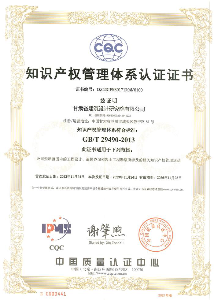 近日,省建筑設計院收到由中國質(zhì)量認證中心頒發(fā)的編號為CQC23IPMS0171ROM/6100的《知識產(chǎn)權管理體系認證證書》,標志著省建筑設計院知識產(chǎn)權管理體系完全符合GB/T 29490-2013標準,這是省建筑設計院在國家層面知識產(chǎn)權領域取得的重要認可,進一步提升了省建筑設計院的綜合競爭力。